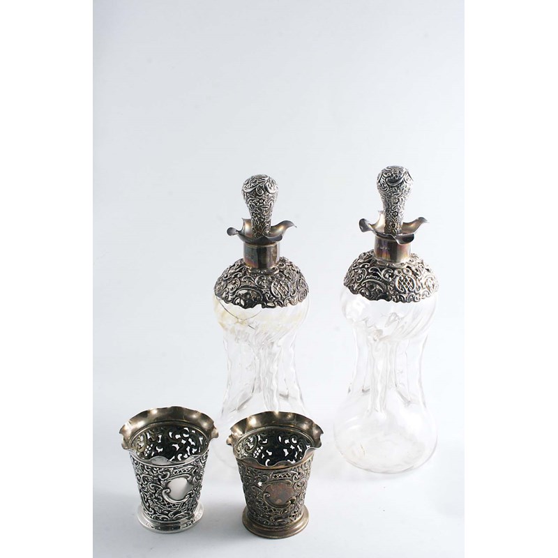 with four pouring spouts (one glass body A/F), by J & W. Deakin, Chester 1897 and a pair of late Victorian planters by the same maker, Chester 1898; the decanters 11.75" (30 cms) high; 4.4 oz weighable silver 94)