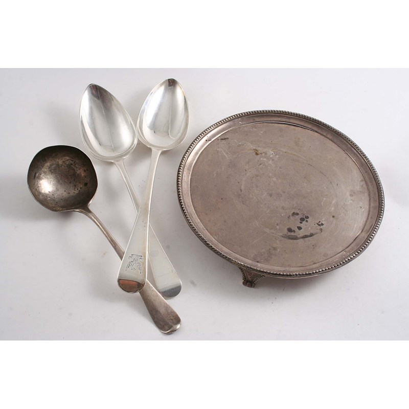 of circular form with a bead border and beaded bracket feet, by Elisabeth Jones, London 1788 together with two George III table spoons (one crested) and a George II sauce ladle, initialled, by Isaac Callard, London c.1750 (maker's mark only, four tines); the waiter 7" (17.5 cms) diameter; 15 oz (4)