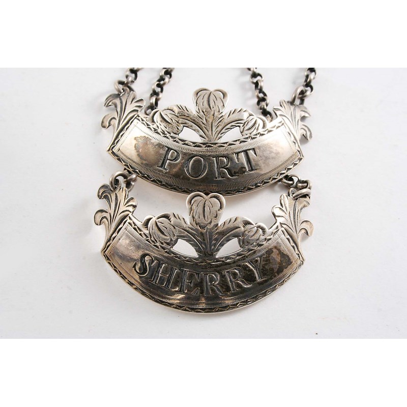 with bright-cut borders and plumed surmounts, incised "PORT" and "SHERRY", maker's mark of Thomas Ollivant of Manchester (overstriking that of Peter & Anne Bateman), hallmarked London 1794; 1.85" (4.7 cms) long; 0.55 oz (2)