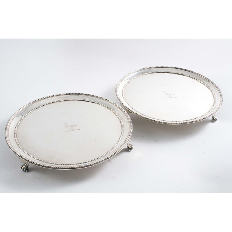 of plain circular form with beaded borders & bracket & paw feet, the centres with an engraved crest*, by Michael Homer, Dublin c.1785 (no date letters); 7" (17.8 cms) diameter; 16.75 oz (2)