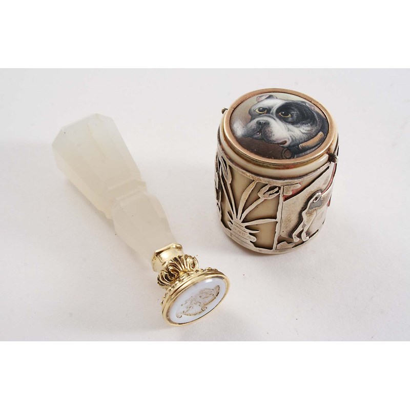 with fret-pierced sides, the pull-off cover enamelled with the head of small bulldog, unmarked, and a 19th century gold-mounted hardstone seal with intaglio coat of arms; the latter 2.3" (5.7 cms) long (2)