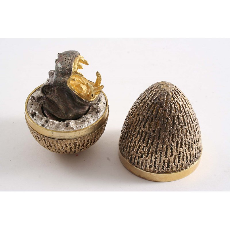 with a textured surface, the parcelgilt interior with the oxidised head of a hippopotamus by Stuart Devlin, London 1973 (in a fitted box with certificate & original bill of sale); 3" (7.5 cms) high; 6.8 oz