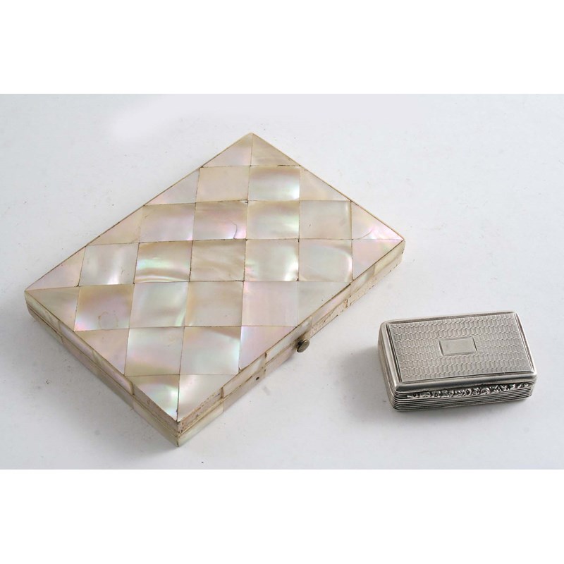 with reeded sides and an engine-turned base & cover with a vacant cartouche, gilt interior, by Thomas Shaw, Birmingham 1832 and a mother of pearl card case; the former 1.9" (4.7 cms) long; 0.9 oz weighable silver (2)