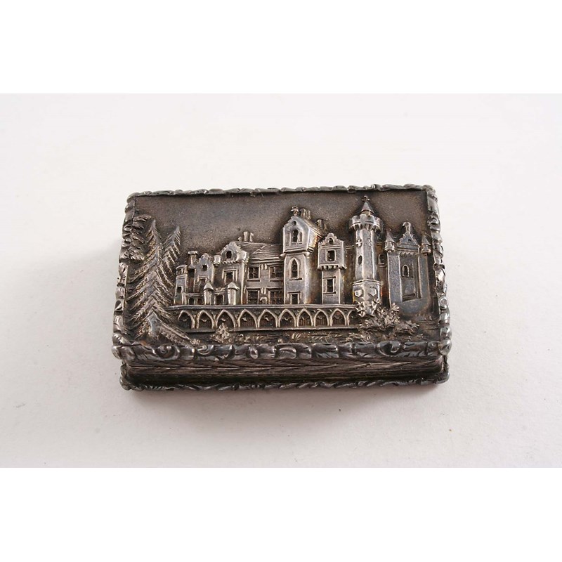 of rectangular outline with a view of Abbotsford House in low relief on the cover, the base with scroll engraving and a vacant shield cartouche, gilt interior, by Gervaise Wheeler, Birmingham 1840; 1.65" (4.2 cms) long; 0.9 oz