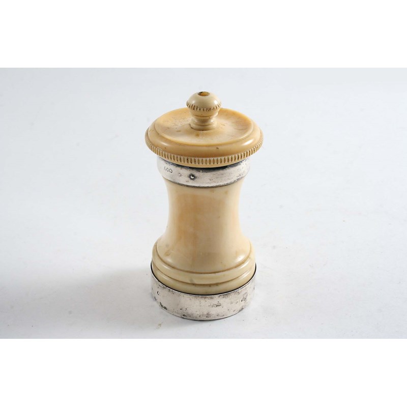 A LATE VICTORIAN MOUNTED IVORY PEPPER MILL of waisted form, with metal innards, marks worn, probably by Joseph Braham, London c.1885; 4" (10 cms) high