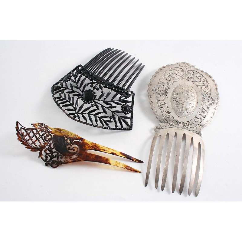 unmarked, a tortoiseshell and jet hair comb and a faux tortoiseshell hair comb; the latter 6" (15 cms) long (3)