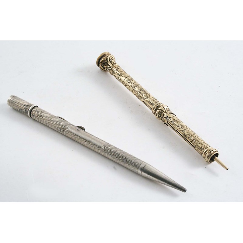 with engraving and a hardstone terminal, initialled, unmarked, and a propelling pencil by Sucklin Ltd., Birmingham 1937; the latter 4.75" (12 cms) long (2)