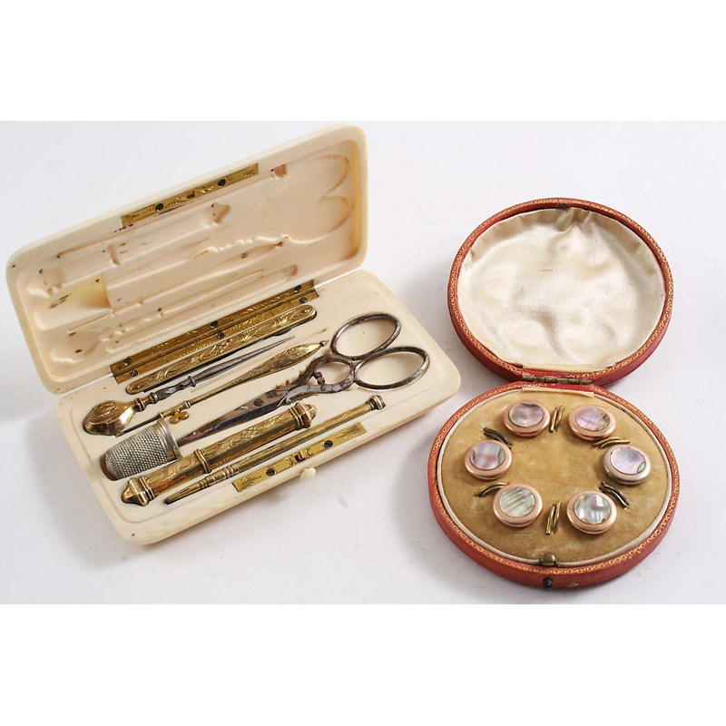 A pen knife, a pencil, a bodkin, a needle case & an unpicking tool (& a pair of later steel scissors & later thimble) and a cased set of six gilt metal buttons; the etui 4.75" (12 cms) long (2)