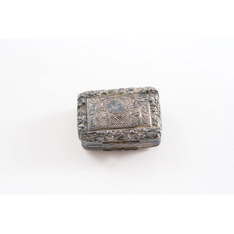 with a chased floral border, basket of flowers on the base & a vacant oval cartouche on the cover, gilt interior, by T & W. Simpson, Birmingham 1821; 1" (2.5 cms) long; 0.3 oz