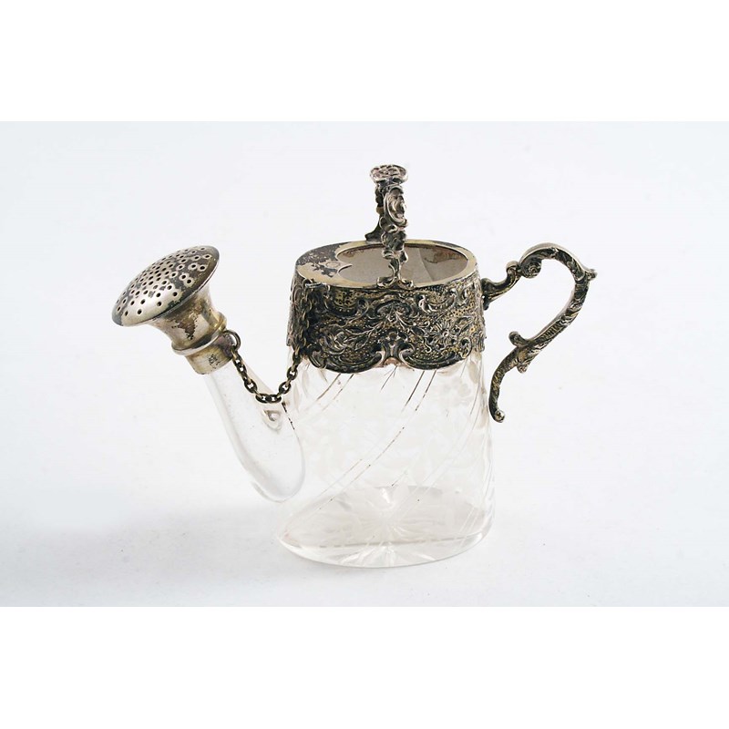 A LATE 19TH CENTURY CONTINENTAL MINIATURE MOUNTED CUT-GLASS NOVELTY WATERING CAN, struck only with two French duty marks, c.1900; 3.75" (9.5 cms) high
