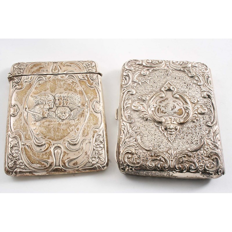with a leather interior, monogrammed, by J. Gammage, Birmingham 1898 and an embossed card case with putti masks on the front, by H. Matthews, Birmingham 1903; the latter 4.1" (10.4 cms) long; 7.1 oz gross (2)