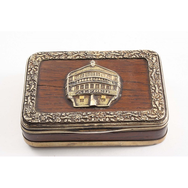 A George III silvergilt mounted wooden snuff box of rectangular form with rounded corners, the cover with an applied border of acorns & oak leaves, centred by the stern of the ship "Alfred", the base with a plaque, engraved with a sailing vessel & the initials "GWtoJF", by Joseph Ash, London 1813; 3.65" (9.3 cms) long