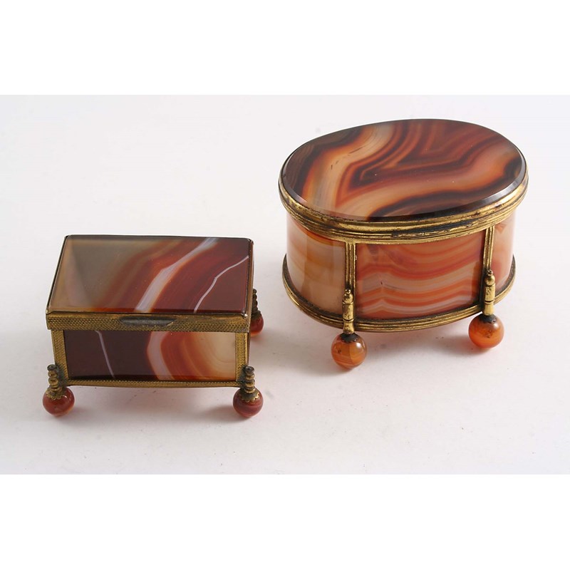 A LATE 19TH CENTURY GILT METAL MOUNTED, BANDED AGATE CASKET oval with reeded borders and four ball feet, together with a similar, smaller rectangular example; the latter 2.3" (6 cms) long (2)