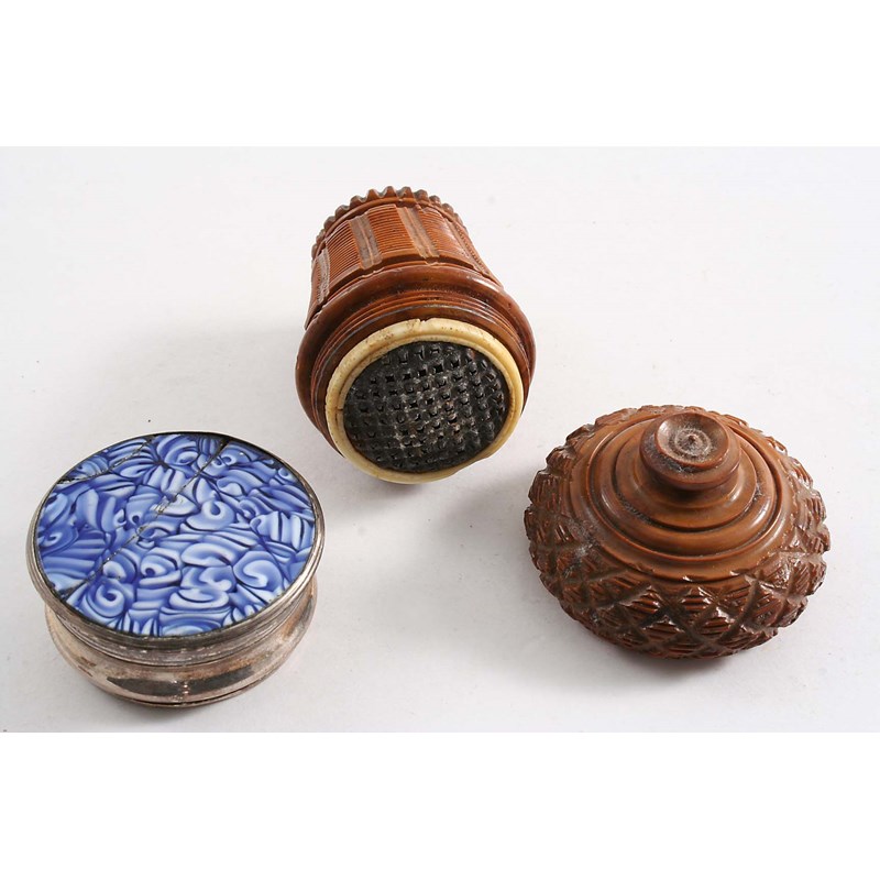 with a screw cover and a lift-out tinned steel grater together with an early period Old Sheffield plated patch box with an inset glass cover, c.1760; the latter 1.6" (4.1 cms) diameter (2)