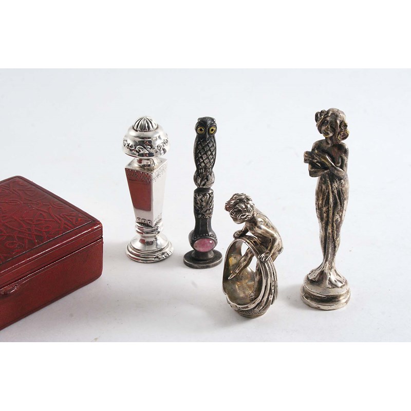 with a knop finial, tapering square body and intaglio crest & motto, maker's mark unclear, London 1893 (in original fitted case), together with a putto & ring seal with import marks for 1913 and two plated seals (one with an owl, one a figure); the cased seal 2.8" (7.2 cms) high; 3.1 oz weighable silver (4)