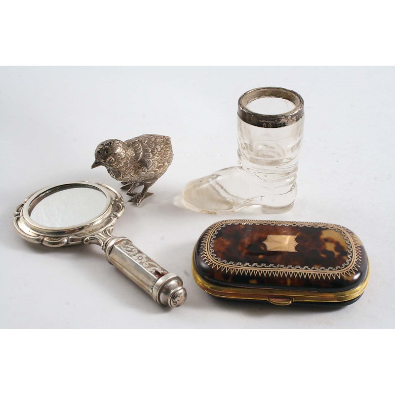 A 20th century Spanish "chick" pepperette, an Edwardian mounted glass vesta "boot", a French gilt-metal and tortoiseshell purse, and a 20th century Italian combined powder compact, mirror & lipstick holder; the latter 5" (12.5 cms) long; (4)