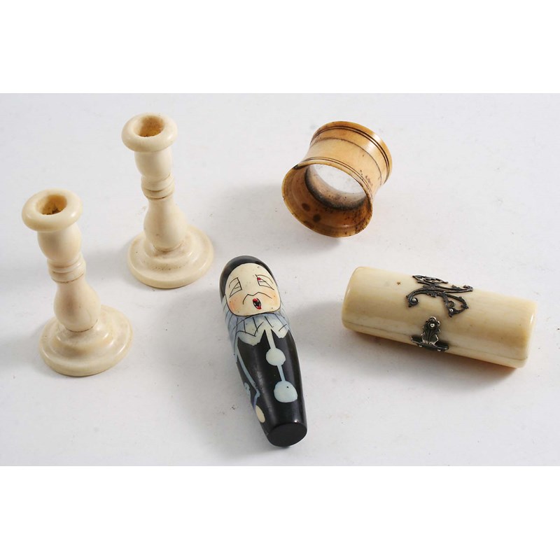 a Victorian mounted ivory scent bottle case (with glass scent bottle inside), a stained ivory scent bottle case resembling a Pierrot figure (with glass bottle inside), 1900-1925 and a turned bone magnifying loop; the candlesticks 2.1" (5.4 cms) high (5)