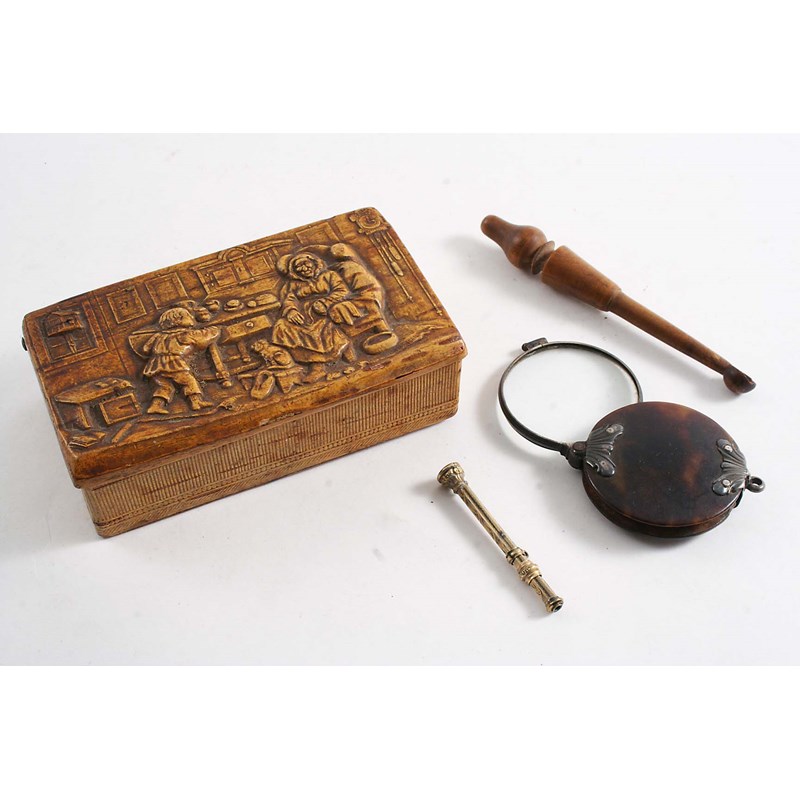 with swing-out lens, a small Victorian gilt-metal pencil, a 19th century European snuff box carved on the cover with a domestic interior scene and a turned wooden snuff spoon; the box 3.8" (9.6 cms) long (4)