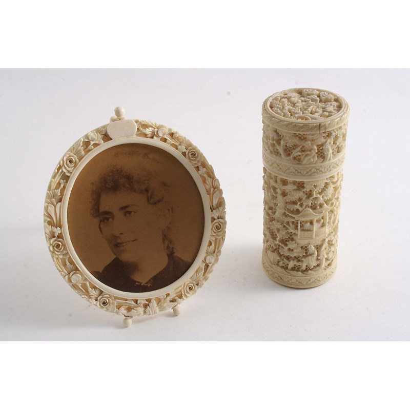 A 19TH CENTURY CHINESE CYLINDRICAL IVORY BOX with carved & pierced decoration & a screw cover, and a small oval carved ivory photograph frame; the box 4.5" (11.5 cms) high (2)