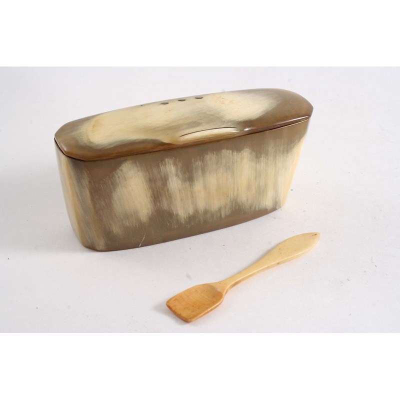 AN 18TH CENTURY HORN SNUFF MULL with a brass hinge, possibly Scottish & containing a bone snuff spoon; 4.3" (11 cms) long