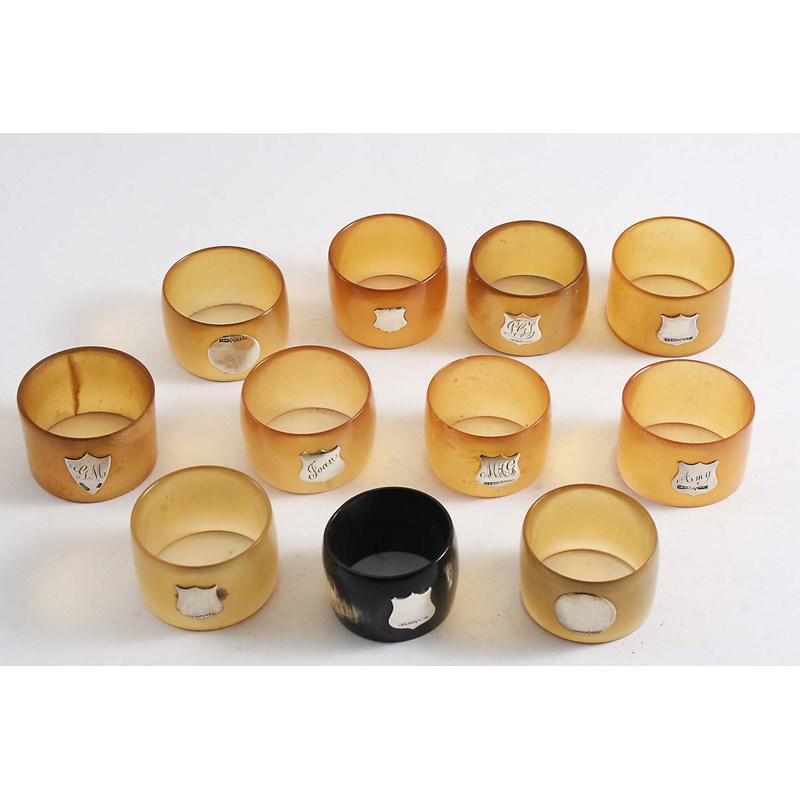 ELEVEN VARIOUS MOUNTED HORN NAPKIN RINGS BY WILLIAM DUNNINGHAM & CO OF ABERDEEN (one inscribed "Amy", one inscribed "Joan" and three with initials); each approx. 1.75" (4.5 cms) diameter (11)
