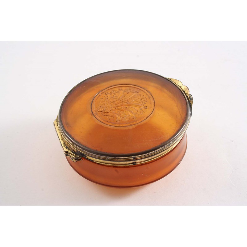 AN EARLY 18T CENTURY GILT-METAL MOUNTED BLOND HORN SNUFF BOX circular with a pressed decorative boss in the centre of the cover, and a small detail on the base; 2.55" (6.5 cms) diameter