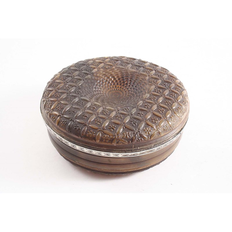 AN EARLY 18TH CENTURY CIRCULAR MOUNTED HORN SNUFF BOX pressed and moulded with a diaperwork pattern in relief on the base & cover, the mount engraved with debased foliage; 3.75" (9.5 cms) diameter