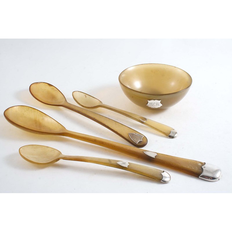 initialled, c.1900 and four various mounted horn spoons (one initialled "M"), hallmarked Edinburgh 1924 and one 1930; the bowl 4" (10 cms) diameter (5)