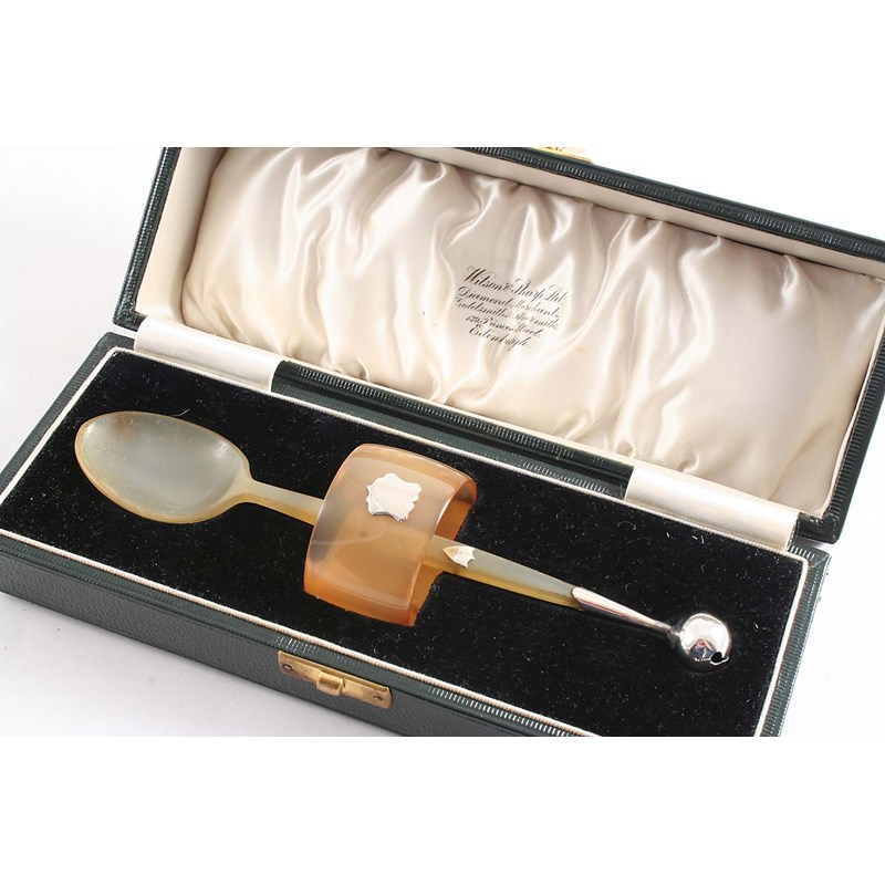 A MOUNTED TRANSLUCENT HORN CHRISTENING SET (napkin ring and spoon with a rattle terminal), in a fitted case, c.1920; the case 8.2" (21.5 cms) long