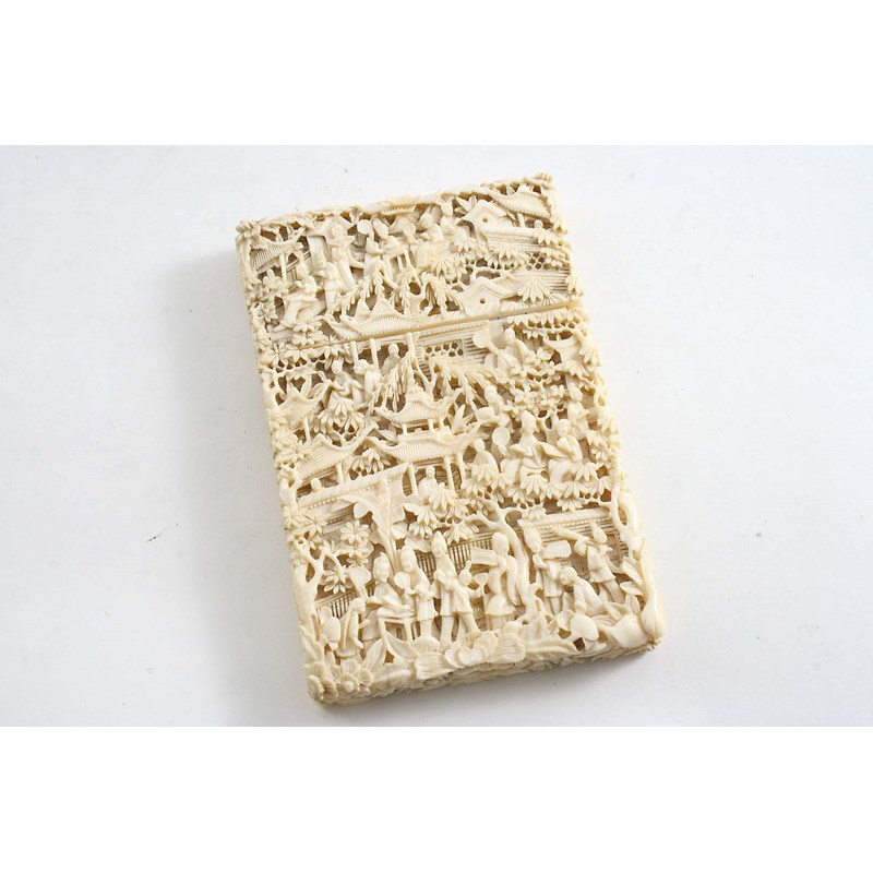 A 19TH CENTURY CHINESE CARVED IVORY CARD CASE profusely decorated with numerous figures in a leafy, architectural landscape, pull-off cover; 4.5" (11.5 cms) long