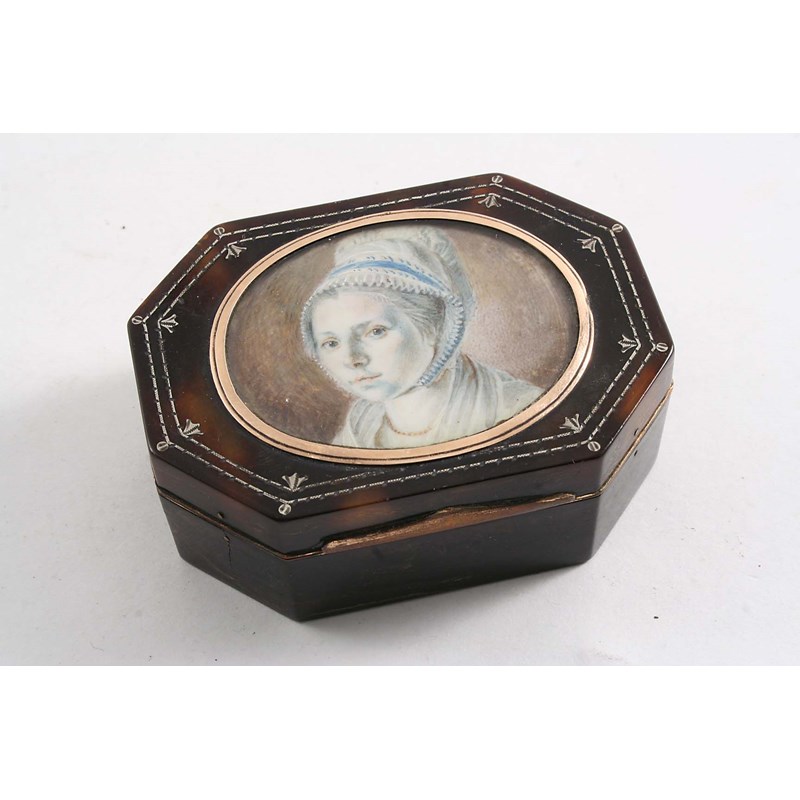 AN EARLY 19TH CENTURY GILT-METAL MOUNTED TORTOISESHELL SNUFF BOX, the cover inside with the portrait of a lady wearing a bonnet, 1800-1810; 2.8" (7.2 cms) long