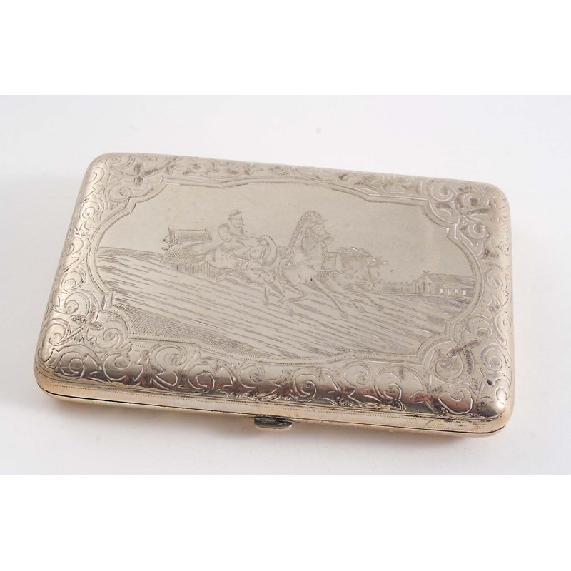 A LATE 19TH / EARLY 20TH CENTURY RUSSIAN ENGRAVED CHEROOT CASE with a troika scene on the cover, gilt interior, maker's mark "CMU?" 1896-1908; 4.2" (10.5 cms) long; 4.1 oz