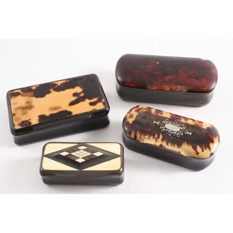 rectangular with a tortoiseshell veneered cover, another with rounded ends, another with inlay work on the cover and a smaller example inset with ivory and a grid of brass wires on the cover; the latter 2.75" (7 cms) long (4)