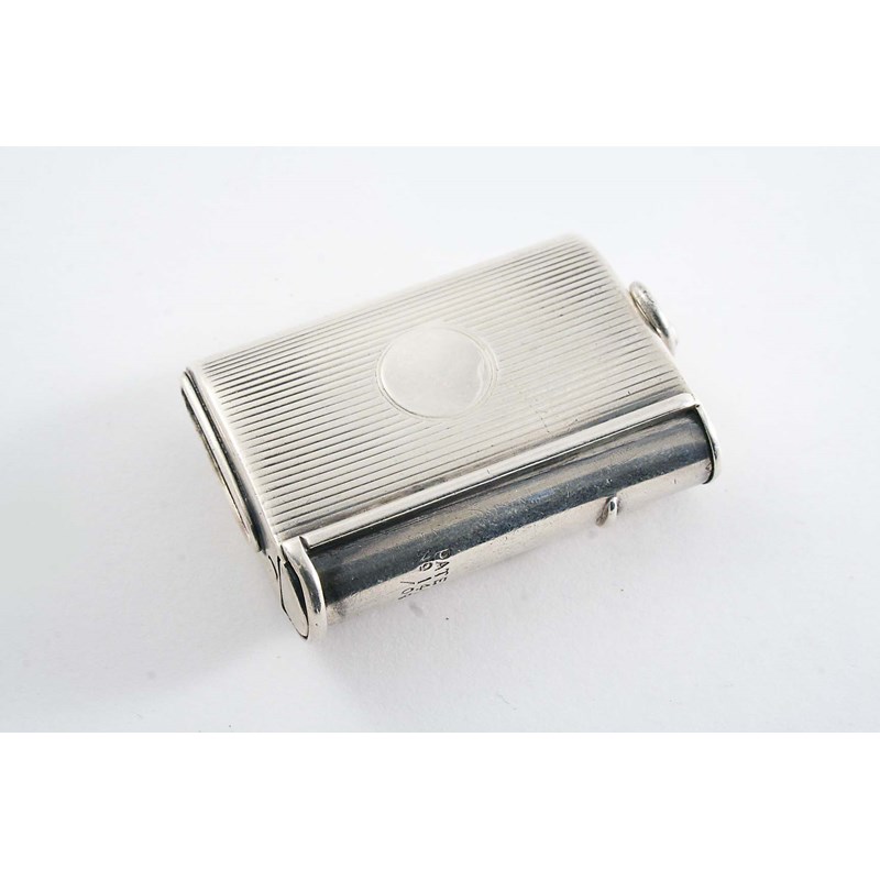 AN EDWARDIAN VESTA CASE with reeded decoration, a vacant circular cartouche and a "patent" slide action (under spring pressure) for accessing the vestas, by M. Wilcox & Son, Birmingham 1908; 1.8" (4.6 cms) long; 0.8 oz