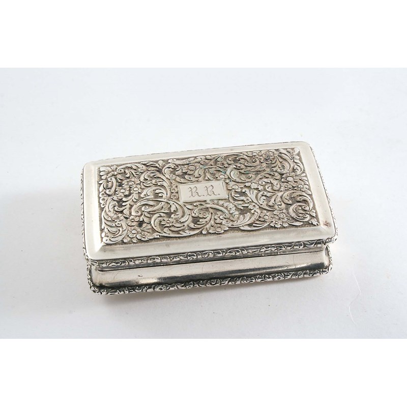 with concaved sides, chased borders and chased scrollwork on the cover, initialled "RR", gilt interior, by Thomas Parkes, Birmingham c.1830 (date letter mis-struck); 2.8" (7.2 cms) long; 2.5 oz