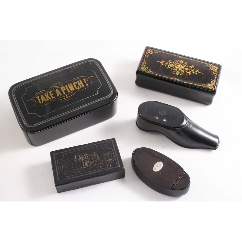 FIVE LATE 19TH CENTURY PAPIER-MACHE SNUFF BOXES