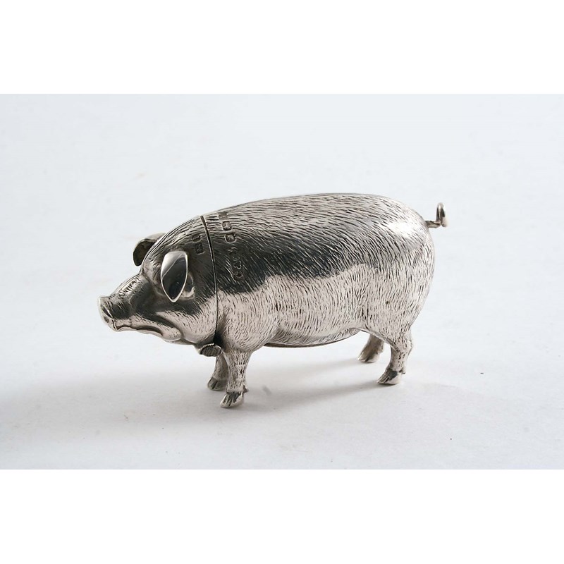 AN EDWARDIAN NOVELTY VESTA CASE in the form of a pig with textured hair, by Cohen & Charles, Birmingham 1908; 2.75" (7 cms) long; 0.75 oz