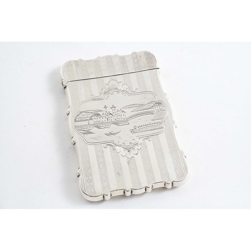 of shaped rectangular form with engine-turned decoration and an engraved view of buildings by a lake in a hilly landscape, the reverse with a cartouche inscribed "S.L Kellogg", with pseudo marks and maker's mark "MW", unascribed, 1850-60; 3.45" (8.8 cms) long; 1.3 oz