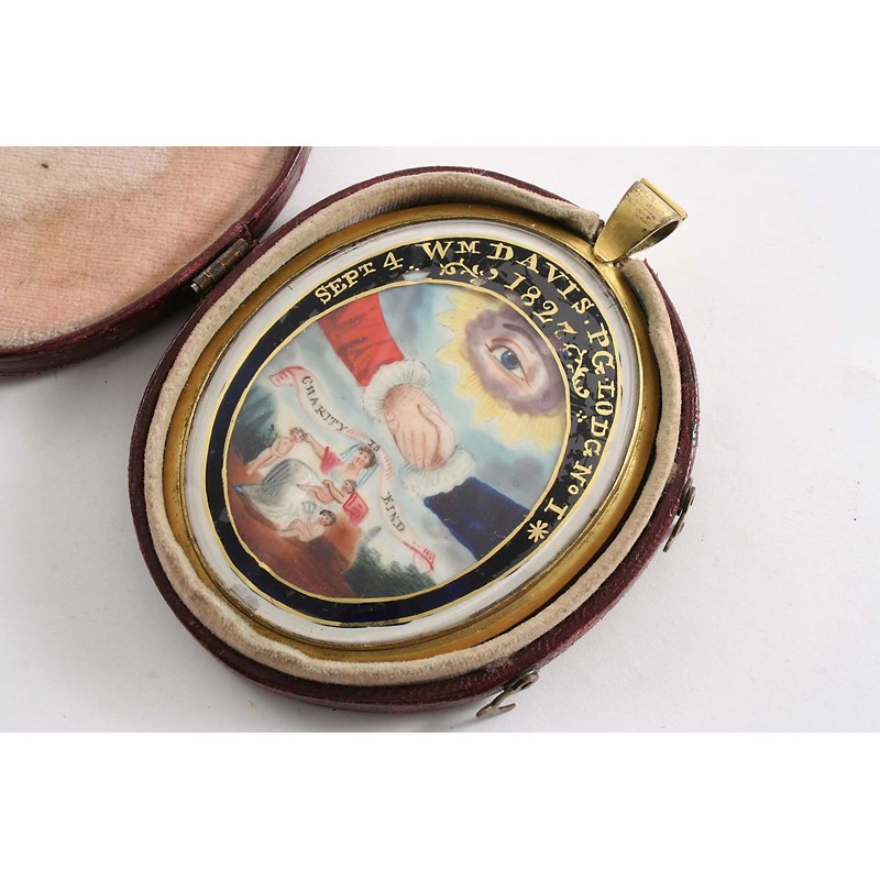 in the form of a gilt-metal oval frame with a miniature painting on each side (behind glass), one side inscribed "Sept 4 WM.DAVIS P.G. LODGE No.1 1827" (in a fitted leather case); 3.5" (9 cms) long