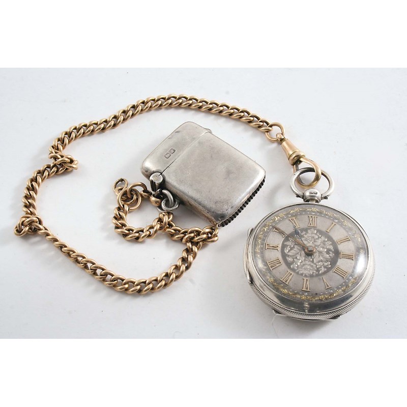 with engine-turned case and applied gold Roman numerals, hallmarked London 1883, on a 9 ct. gold watch chain, in turn attached to a vesta case, hallmarked Chester 12912; the watch 1.55" (4 cms) diameter
