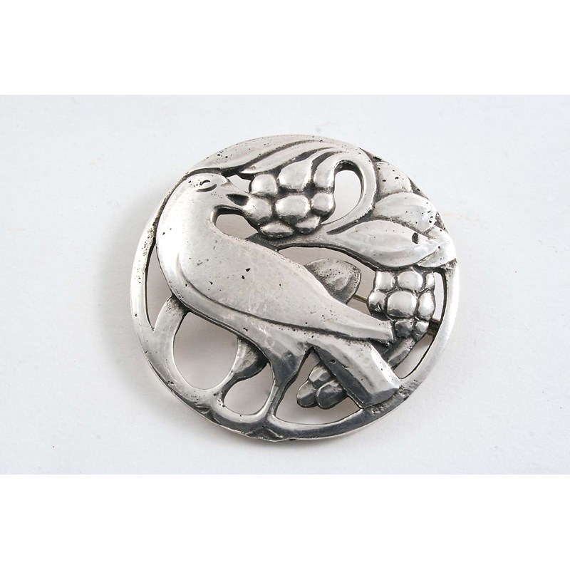 A 20TH CENTURY CONTINENTAL BROOCH pierced with a crow eating grapes, maker's mark "NH" & "M2", also struck with a duty mark; 1.6" (4 cms) diameter; 0.6 oz
