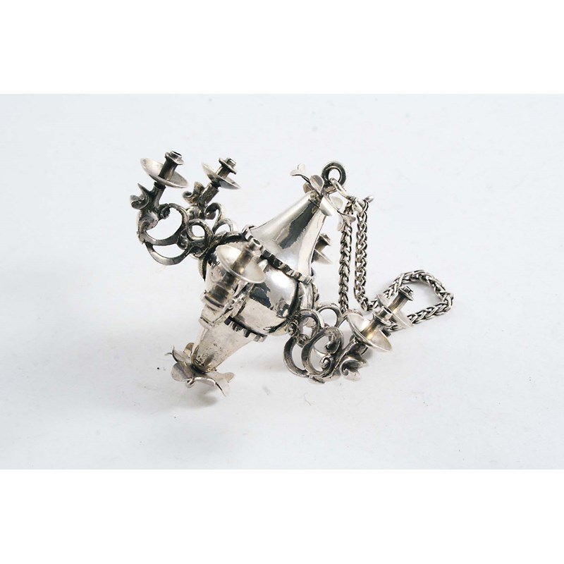 with six lights, scroll branches and a suspensory chain, unmarked, probably Dutch, 19th century; 3" (7.5 cms) wide overall; 1.5 oz
