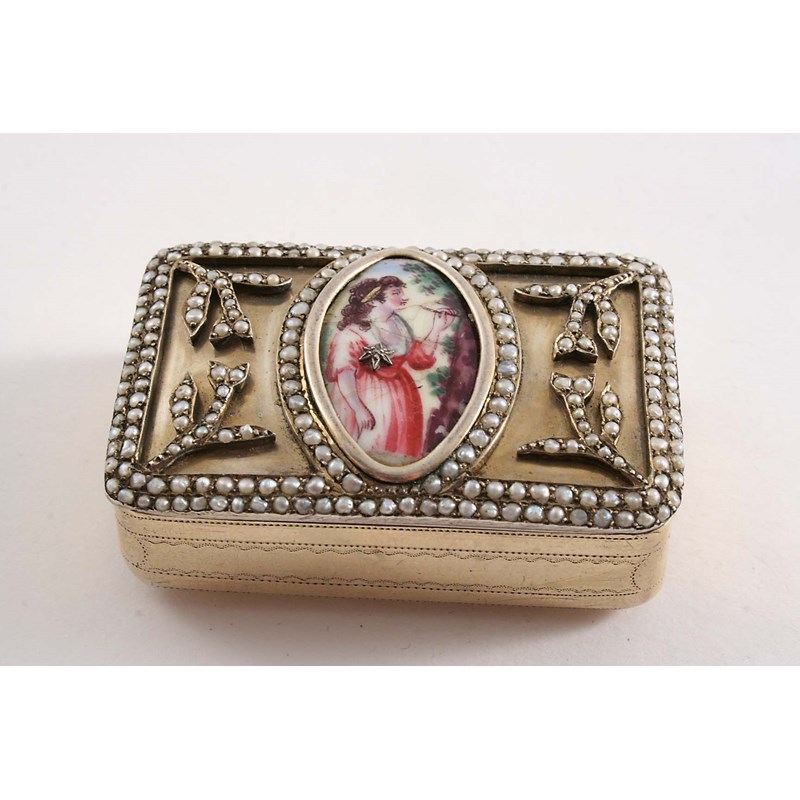 rectangular with border-engraving, the cover set with seed pearls and an enamelled portrait of a girl, by John Shaw, Birmingham 1812; 2.4" (6 cms) long; 2.2 oz (gross)