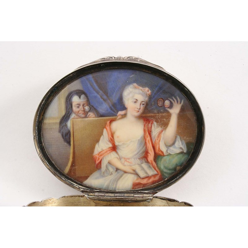 A 19TH CENTURY CONTINENTAL MOTHER OF PEARL MOUNTED OVAL BOX with an engraved scroll frieze around the sides, a hinged cover set with a pattern of mother of pearl tiles and opening to reveal a risque portrait miniature (behind glass), the base with a concealed hinge, also opening to reveal a classical portrait miniature )behind glass), struck only with indistinct, small duty marks; 2.75" 97 cms) long; 4.6 oz gross
