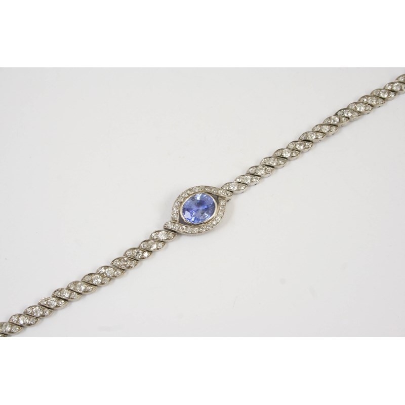 the oval-shaped sapphire is set within a surround millegrain set with graduated old brilliant-cut diamonds, with further graduated old brilliant-cut diamonds set to the bracelet, 17.5cm long