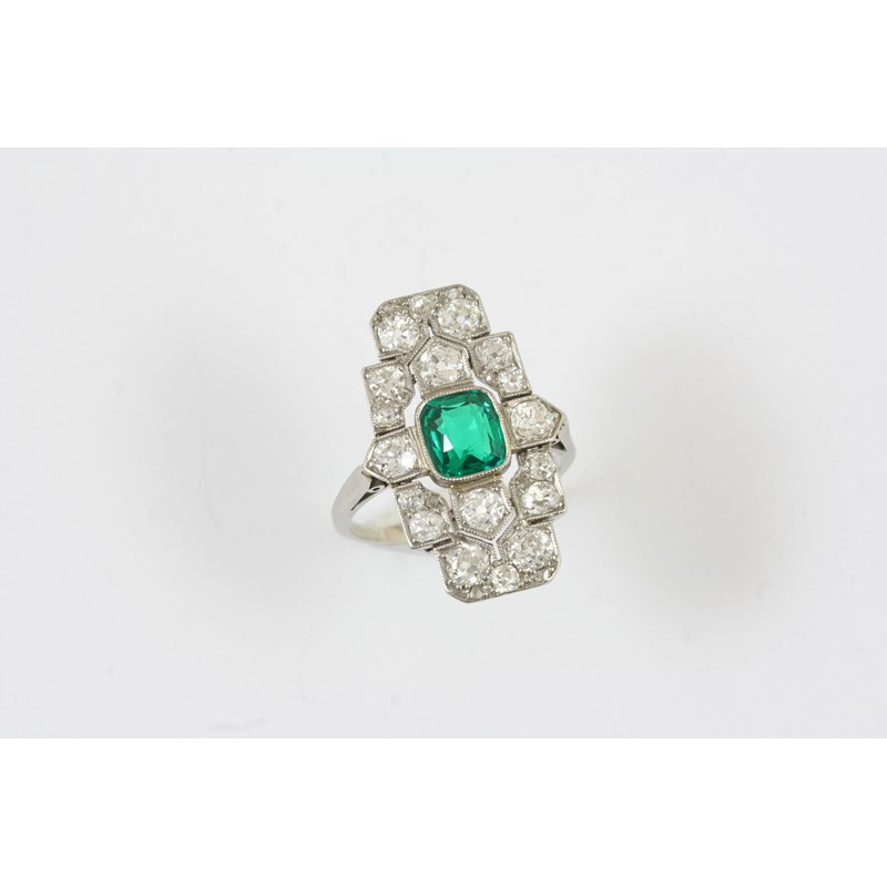 AN ART DECO EMERALD AND DIAMOND CLUSTER RING