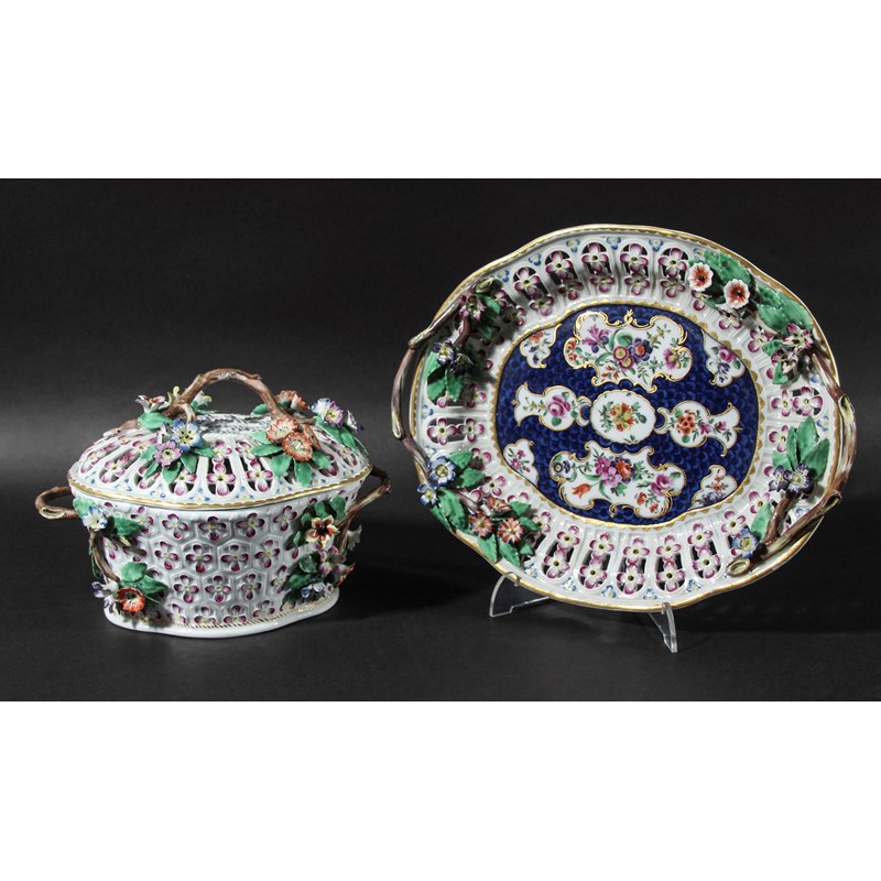 circa 1770, pierced and encrusted with flowers and twig handles, the interior with cartouches of flowers on a blue scale ground, blue fret marks, length of stand 27cm