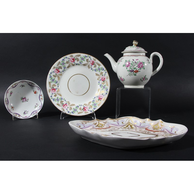circa 1780, painted with floral sprays, length 19.5cm; together with a pair of Derby plates painted with pink roses to the rim; a pair of lozenge shaped dishes with painted swag decoration and a saucer (6)