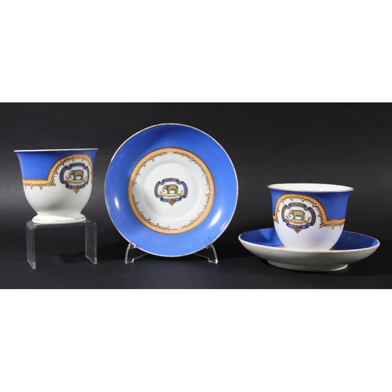 a pair of English porcelain armorial breakfast cups and saucers, early 19th century, painted with an elephant beneath the regimental title and above a banner inscribed 'Assaye', on a cobalt blue, salmon pink and white ground, diameter of saucer 16.5cm (2)