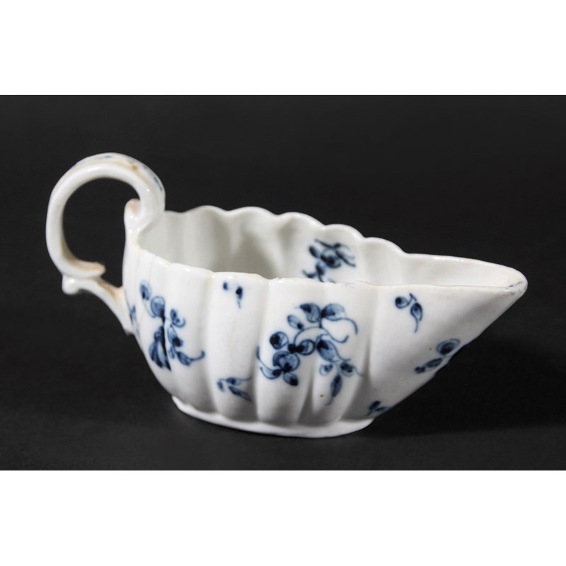 ENGLISH PORCELAIN BUTTER BOAT, possibly Bristol or Plymouth, circa 1770-80, of reeded form blue painted with floral sprigs, scrolling handle, blue X to the base, length 12cm Provenance: Simpson Collection, 248